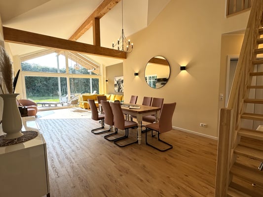 Unsere Ferienhäuser bieten auf rund 105 m² großzügigen Raum mit drei Schlafzimmern und zwei Bodenkojen Platz für 6 Erwachsene und 4 Kinder. Zudem verfügt es über ein luxuriöses Bad inklusive Sauna/ Art Sauna Infrarotkabine, sowie Whirlwanne, einer voll ausgestatteten Küche, einem gemütlichen Wohn-Essbereich mit Holzofen und einer überdachten Sonnenterasse mit eigenem privaten Garten.